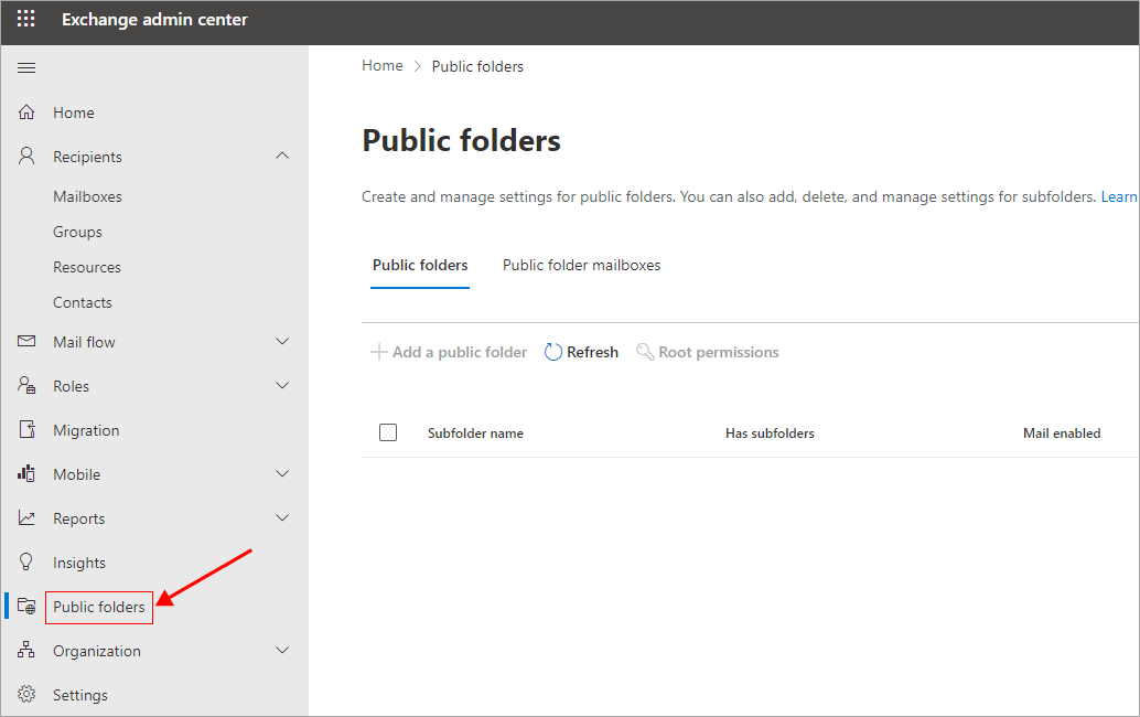 - Navigate to the 'Public folder mailboxes' tab and click the '+ Add a public folder mailbox' button