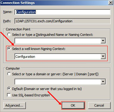 - In the ‘Connection Point’ group box, click 'Select a well known Naming Context' and select 'Configuration' option from the drop-down menu and click the 'Ok' button.