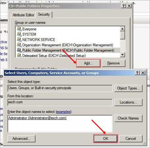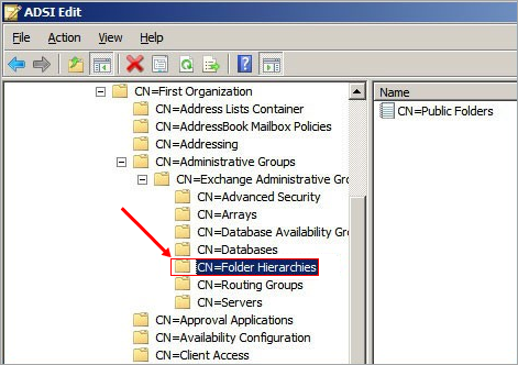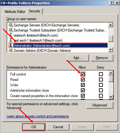 Right click on the 'CN=Public Folders' and select 'Properties' option. In the 'Security' tab check if the user to whom you want to give the full control over public folders is listed under Group or user name. If not, click 'Add', type the name of the user and click the 'Check Names'. Once the correct name is found and displayed, click the 'OK' button.