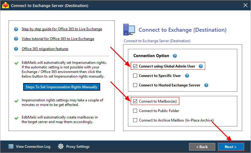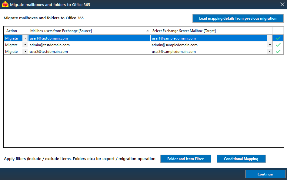 - Select the mailboxes / folders for the migration and click ‘Migrate to Exchange’