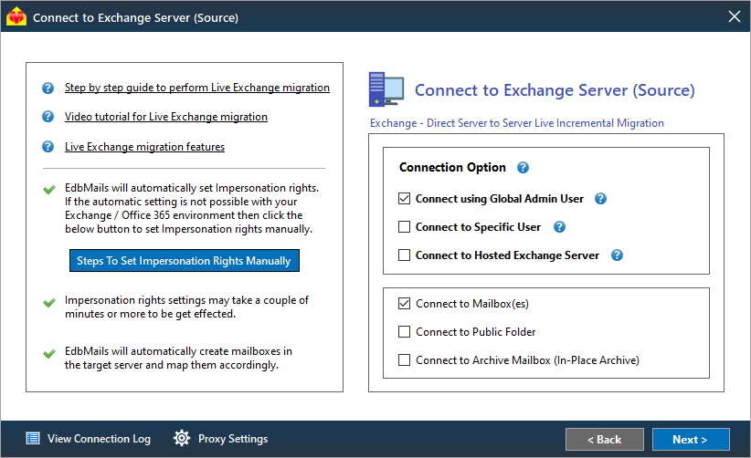 EdbMails is the perfect solution for Exchange migration, offering a range of advanced features such as concurrent mailbox migration, incremental migration, automatic throttling management, and automatic mailbox mapping etc. The software supports the migration of various mailbox types, including user mailboxes, public folders, archive mailboxes, and shared mailboxes, ensuring the successful migration of essential email data from the source to the target server regardless of the Exchange server versions.