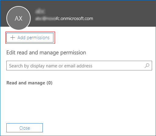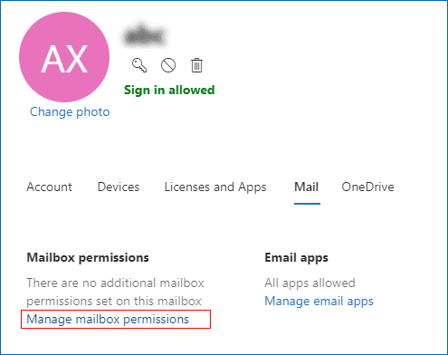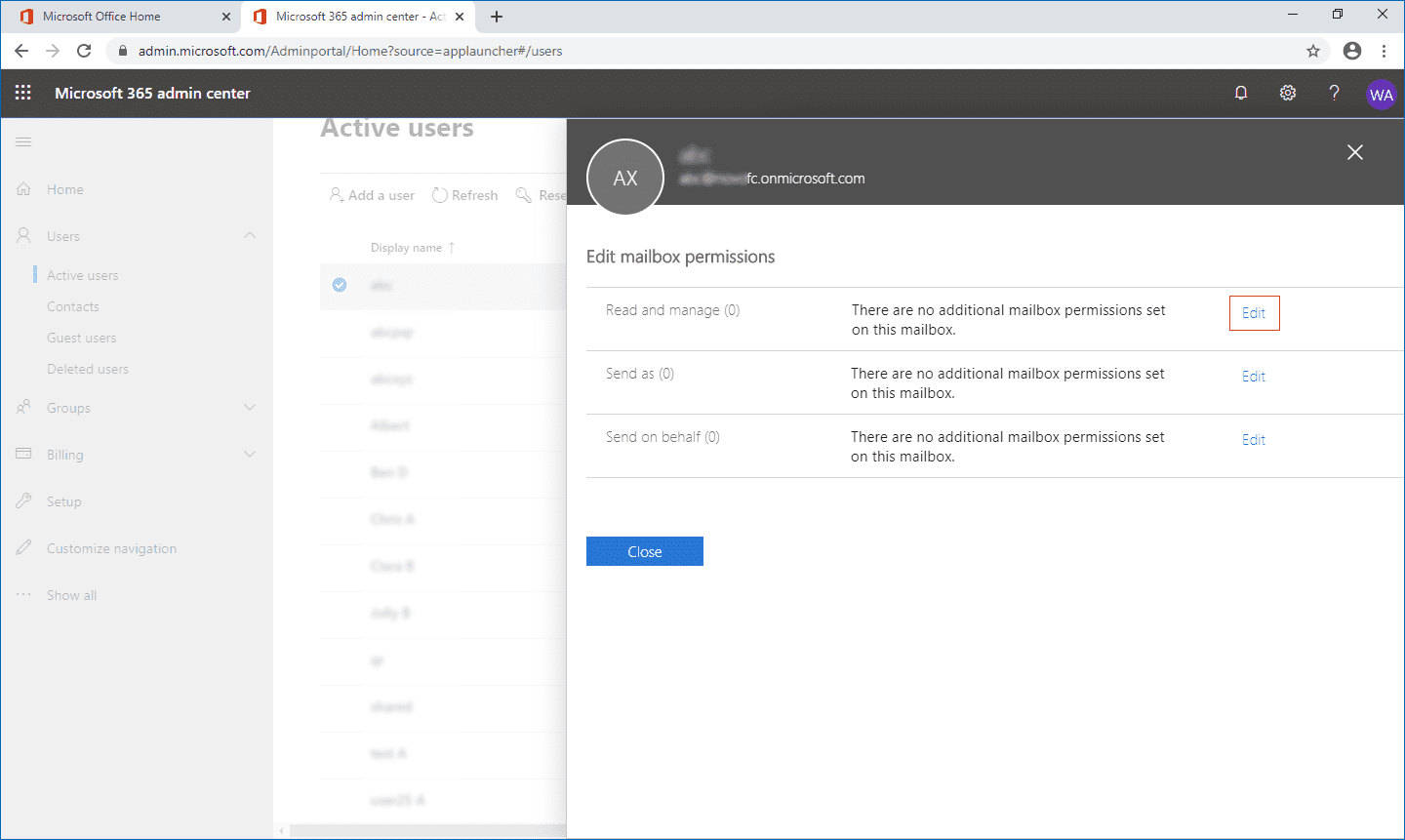 8. To edit the mailbox permissions, click the Edit option in the Read and manage row.