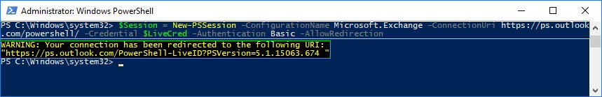 Command: Copy & Paste it on PowerShell$Session = New-PSSession -ConfigurationName Microsoft.Exchange -ConnectionUri https://ps.outlook.com/powershell/ -Credential $LiveCred -Authentication Basic -AllowRedirection