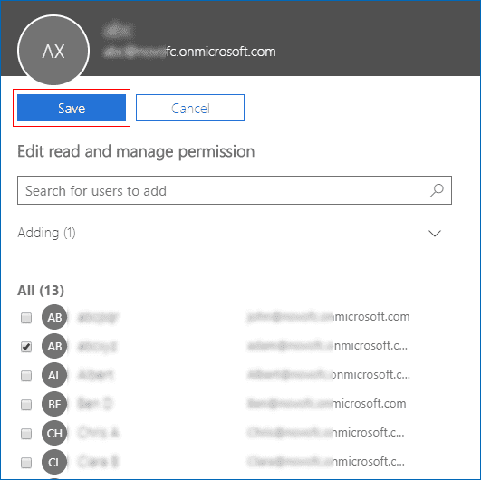 10. In the next window, list of users will be displayed where you need to select the user(s) to set permissions and click Save button to set full access permissions