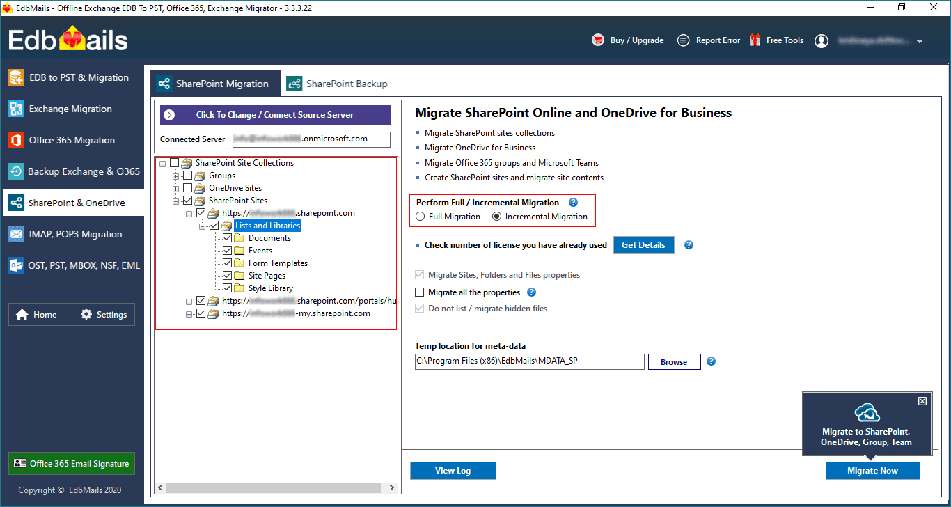 EdbMails SharePoint Migration Tool lets you easily migrate SharePoint sites between Office 365 tenants. You can migrate bulk sites, lists, libraries, documents, folders, files, site pages, and more. With secure, concurrent migration, you can ensure a fast and smooth migration of your data to a new tenant.